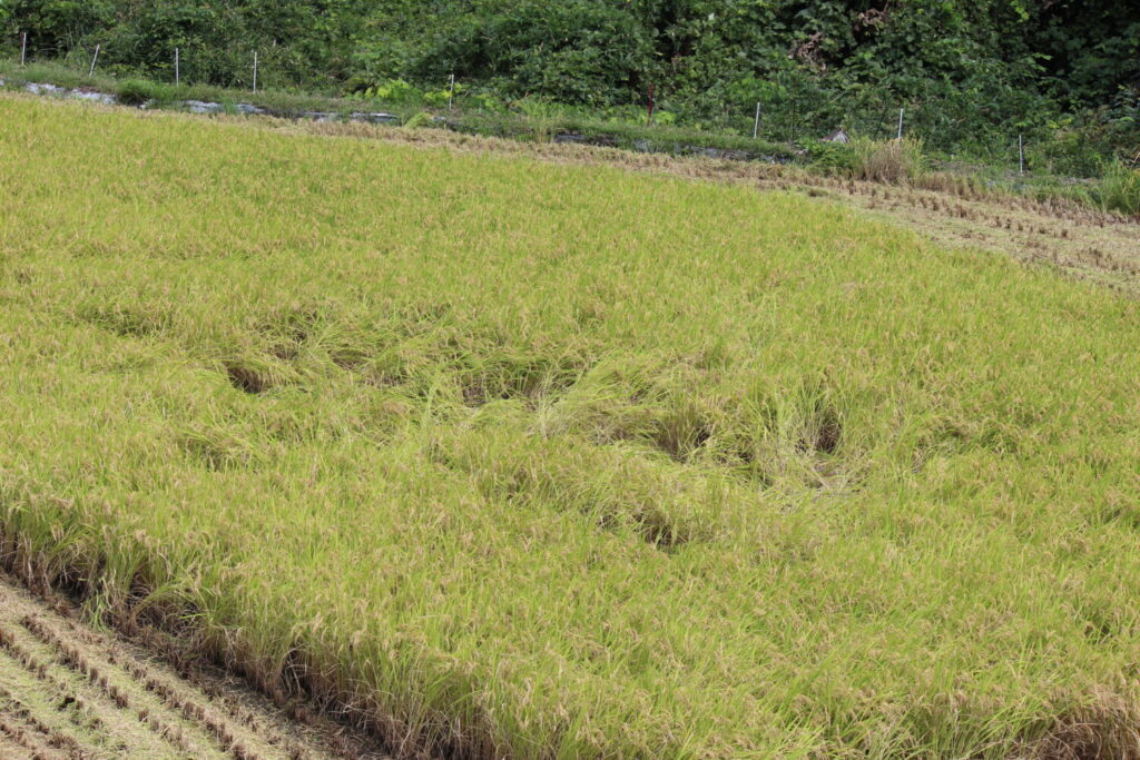 田んぼの真ん中あたり、稲が倒れている部分はイノシシが遊んで稲を倒していった跡。