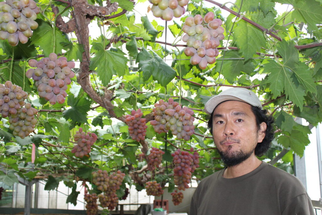 ここの土には竹を粉砕してパウダーのようにした竹チップが入っています。友達に米農家さんがいるので、稲刈りなどを手伝った報酬として藁をもらい、それもパウダー状にして入れています。今は900坪の葡萄ハウスを手掛けていますが、全部有機農法で栽培しています。草生栽培といって、草を生やしながら栽培しているハウスもあります。蟹殻とか、海の物関係の肥料とかは買いますが、基本的にはこの地域で採れるものを自分で加工して肥料にして土に与えるようにしています。