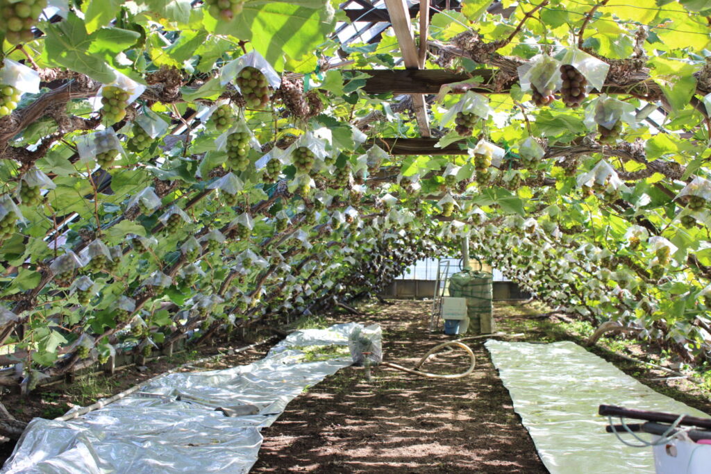 房の上のビニールカバーは9月に入ってから取り付けました。葡萄に色が付き始めると鳥に食べられてしまうことがあります。ハウスの中で育ててはいますが、ここのハウスには隙間があるので鳥が入ってくることがあり、鳥よけとしてつけています。