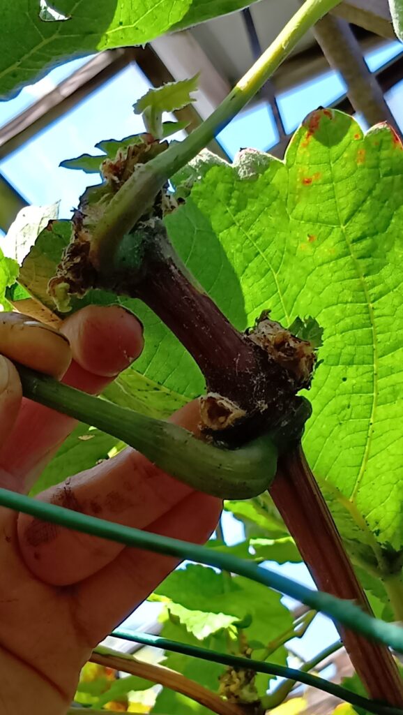 2月の基肥以降は肥料やりません。今年はミスをしてしまい整枝の段階で必要な葉を除去してしまい、どうなることかと心配しましたが、ここまでがんばって大きくなってくれました。夏の間は水やりと、粒間引き、あと、脇芽がすぐに伸びるのでそれをひたすら取っていました。脇芽を放っておくと、それが伸びて木になっていき、茂り過ぎて日差しが遮られたり、養分がとられてしまったりするので、出来るだけ早く取り除かなければいけません。脇芽をとっても2~3日後にはすぐに出てきてしまうので、夏場はサウナのような温室で脇芽の除去に追われます。