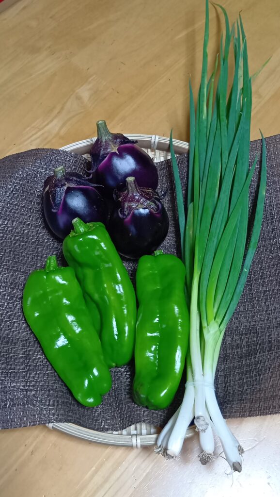 取材前日のマルシェで購入させていただいた米ナス・ジャンボピーマン・九条ネギ